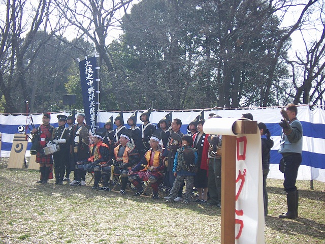 日本鷹匠協会とバグパイプ演奏と西洋流火術鉄砲隊の演武団体の方達が